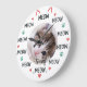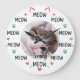 Toda hora é a hora do "miau" com este charmoso relógio de parede personalizado! Projetado especificamente para os amantes de felinos, este relógio substitui os números tradicionais pelo texto divertido "MIU", acentuado por pequenos corações rosa, pegadas verdes e ilustrações de orelhas e bigodes fofos.