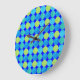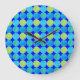 Um relógio de parede chic com um padrão 'grid' ousado de luas azuis em Turquesa, Neon Green e Teal sobre um fundo azul desolador que você pode mudar se desejar - Preto ou Branco também parece bom. Parte da coleção 'Luas Azuis' de Posh & Painterly.