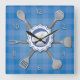 Relógio de Muro Quadrado dos Chefs. Um relógio de cozinha giro que apresenta um chefs rodeado por utensílios de cozinha em um fundo azul controlado.