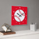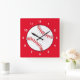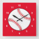 Este relógio de parede quadrado apresenta um basebol vermelho e branco cercado por um fundo vermelho. Excelente para o fã desportivo especial!