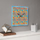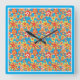 Um relógio de parede quadrado bonito com um padrão de flores vermelhas, laranja, amarelas sobre fundo Turquesa brilhante e borda azul Turquesa, de uma colagem de papel pintada à mão por Judy Adamson. (Coordena-se com a coleção floral laranja, Orange Fizz.)