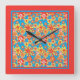 Um relógio de parede quadrado bonito com um padrão repleto de flores vermelhas, laranja, amarelas sobre um fundo turquesa brilhante e uma borda escarlate, de uma colagem de papel pintada à mão por Judy Adamson.
