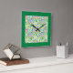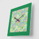 Um relógio de parede quadrado muito bonito, com um padrão de primatas cor-de-rosa, amarelas e azuis, de um design de cor d'água pintado à mão por Judy Adamson. A borda deste relógio está em Forest Green, mas outras cores estão disponíveis.