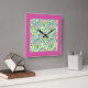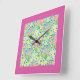 Um relógio de parede quadrado muito bonito, com um padrão de primatas cor-de-rosa, amarelas e azuis, de um design de cor d'água pintado à mão por Judy Adamson. A borda deste relógio está em rosa, mas outras cores estão disponíveis.