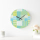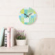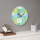 Um relógio de parede redondo bonito, com um padrão de manchas falsas de narcisos ouros na turquesa, agrupados com bolinhas correspondentes, marque martelos e listras, da coleção Posh & Painterly 'Primavera Sunshine'.