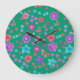 Um relógio de parede redondo bonito, com um padrão de flores em roxo, turquesa, rosa e laranja sobre fundo verde-marinho, de uma colagem de papel pintada à mão por Judy Adamson. Você pode mudar facilmente a cor do plano de fundo usando o botão Editar.