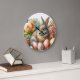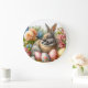 Este relógio de parede é projetado para decoração de casa da Páscoa. O design apresenta um coelho selvagem adulto em meio a flores e ovos coloridos em estilo vintage. É uma obra de arte gerada por IA com direção de design por Susang6.