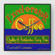 Um relógio de parede de cozinha com uma nova etiqueta de café com vista para o vintage lendo trabalho de arte do Excel-o-rator Café, Qualidade e Satisfação Todas as Vezes em letras retrógradas.