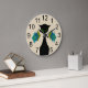 O relógio Legal do Meio século Gato Moderno na parede apresenta um gato preto estilo 1950s - 1960s com olhos verdes e placas gráficas retrovisoras em verde e azul. O fundo está esbranquiçado.