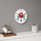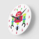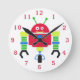 O relógio da parede das crianças é feito em branco, com gráficos de desenho de um robô vermelho, verde, azul e amarelo, com números vermelhos para as horas. Personalize para adicionar seu próprio texto. Os produtos correspondentes estão disponíveis.