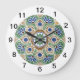 Este Charming Wall Clock apresenta um círculo de medalhões azul, verde e bronzeado. Este relógio de parede pode funcionar em qualquer sala. Os números são grandes para facilitar a leitura. Este é do Azulejo de Oregon Fay Jones Day.