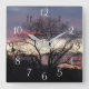 Este encantador relógio de parede mostra uma fotografia de um pôr do sol em camadas e lindamente colorido como visto através da silhueta de um carvalho.