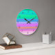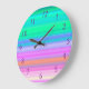As tiras de cores tropicais cobrir este relógio grande redondo. Brilhante e bonito, perfeito para a casa de praia! Os números estão em púrpura contrastante para uma leitura fácil.