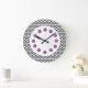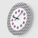 Bonito relógio de parede roxo impresso com gemstone preto com padrão de gemstone preto branco e cinza zigzag chevron na face do relógio nesta design de decoração de parede para a sua cozinha, sala de jantar, dormitório ou qualquer quarto na sua casa que você queira adicionar alguma cor e caráter. Projetado para senhoras ou adolescentes que gostam de fazer um salto moderno com sua decoração.