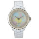 Este belo relógio é adorado com uma pintura abstrato moderna de círculos cor pastel em rosa, azul e amarelo. Você pode personalizá-lo adicionando seu texto ou excluindo-o para deixá-lo vazio. É baseado em uma peça de arte original por © One Artsy Momma.