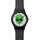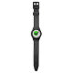 O rosto do relógio tem alienígena. A banda é preta e sólida.