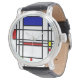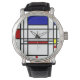 O relógio Mondrian Modern Art tem uma seção como Composição 10 de Pieter Piet Mondrian em vermelho, azul, amarelo, preto e branco, o mais conhecido do grupo de arte De Stijl que usou três cores primárias com linhas pretas em um fundo branco