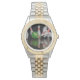 Um relógio com uma fotografia de pinos de boliche sendo derrubados por uma bola de boliche verde.