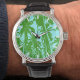 Um padrão é de palmeiras tropicais contra o céu limpo, com efeito posterizado. Design verde e azul. .