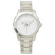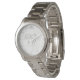 Mostrado em aço inoxidável colorido Prata, este relógio estilo bracelete tem uma face branca com marcas numéricas de tempo de Cinza Prateada, Cinza de cor prata coroa coroa de trabalho de rolagem às 12 horas, seus três monogramas personalizados e uma linha de texto personalizada sob seu título, data especial, etc. Tem uma segunda mão. Escolha seu estilo de relógio favorito, etc. Personalizar este item.