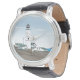 Este desenho apresenta um farol branco, verde e preto sobre o mar. O céu é azul com algumas nuvens. Casas brancas com telhados verdes cercando o farol. Esta design está disponível em mulheres, homens e relógios infantis.