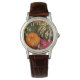 Um relógio clássico de couro castanho com imagem de uma abóbora laranja e verde e uma abóbora amarela em folhas vermelhas, douradas e verdes. Face opcional do relógio prateado. Consulte o charme redondo correspondente e o chaveiro de acrílico de lado duplo retangular. Veja toda a coleção de Ação de Graças na categoria ACESSÓRIOS na seção HOLIDAYS.