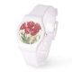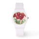 © Carol Rowan/Wild Apple. Um monte de tulipas coloridas rubis com folhas e caules. A imagem tem um fundo branco plano.