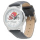 Este legal e elegante relógio de criança da moda moderna. É um belo relógio de moda com um número numérico roman preto. Um vermelho brilhante com capacete de futebol listrado amarelo. Sentado ao lado de um futebol americano marrom e branco.