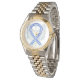 O relógio de pulso apresenta a arte de um anjo de faixa de reconhecimento listrado azul e branco. A mensagem no relógio anota "TIME 2 HOPE", mas pode ser personalizada para mudar a mensagem para "CURE" ou outras palavras. Este relógio de pulso da fita de reconhecimento de faixa azul e branca faz com que as joias de anjo da fita de reconhecimento do excelente sejam presentes! A cor da fita de sensibilização estriada azul e branca significa apoio à esclerose lateral amiotrófica (ELA), frequentemente referida como doença de Lou Gehrig. Que este anjo de reconhecimento de fita azul e branca dê-lhes apoio!
