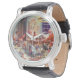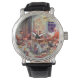 Um belo relógio de vintage com Papais noeis com seus elfos na oficina.