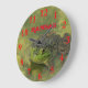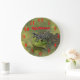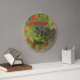 Uma imagem de um Sapo de Touro Verde que está sentado na areia verde. No Lago Sterling, em Sterling Kansas, isso é brilhante e colorido. Isso é num Relógio de Parede Redonda.