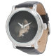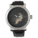 Este relógio de homem mostra uma lua fixa no rosto com pulso preto de couro e prata nas costas.