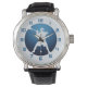relógio do jogador de lacrosse. Atirador de Lacrosse. Bloqueado, cozido e pronto para o rock. Silhueta de jogador de lacrosse segurando pau, no meio de disparar uma foto sobre o objetivo. Design de emblema circular em blues com raios emanantes.