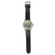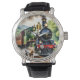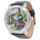 A nostalgic scene of a dog greeting the arrival of a green steam train.