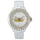 Este relógio branco e estone apresenta uma coroa de ouro no rosto. Sinta-se como uma rainha enquanto veste este relógio! Os números são um modelo e podem ser removidos escolhendo ‘Personalização’.