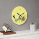 Dragão dourado em verdes e dourados, senta-se no fundo do relógio. Quatro algarismos (12, 3, 6 e 9) são pretos. Tudo colocado sobre fundo amarelo claro.