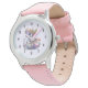 Um relógio com uma ilustração de um dragão mítico. Escalas púrpura e azul. Uma coroa dourada florida com chifres enfeita sua cabeça. Magia, divertida e amigável.