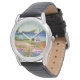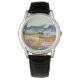 Dois veleiros e algodão I por Karen Fields. Cena brilhante, divertida com flores, árvores, um chalé e veleiros na água.