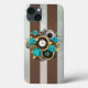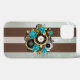 Relógio antigo e patenteado, adornado com joias, mãos de ouro e algarismos latinos com rosa de turquesa sobre fundo castanho e listrado. Estilo Steampunk.