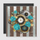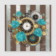 Relógio antigo e patenteado, adornado com joias, mãos de ouro e algarismos latinos com rosa de turquesa sobre fundo castanho e listrado. Estilo Steampunk.