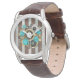 Relógio antigo e patenteado, adornado com joias, mãos de ouro e algarismos latinos com rosa de turquesa sobre fundo castanho e listrado. Estilo Steampunk.