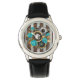 Relógio antigo e patenteado, adornado com joias, mãos de ouro e algarismos latinos com rosa de turquesa sobre fundo castanho e listrado. Estilo Steampunk.