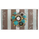 Relógio antigo e patenteado, adornado com joias, mãos de ouro e algarismos latinos com rosa de turquesa sobre fundo castanho e listrado. Estilo Steampunk.