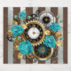 Relógio antigo e patenteado, adornado com joias, mãos de ouro e algarismos latinos com rosa de turquesa sobre fundo castanho e listrado. Estilo Steampunk.