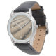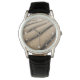 Um relógio elegante com duna como imagem de fundo.
