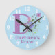 Relógio de quarto de criança. Relógio de quarto para crianças. Design apresenta Monograma & Nome com Flores em ambos os lados no estilo pastel de cor de água. O nome de exemplo é Barbara. Altere o nome conforme desejado para qualquer pessoa com um nome que comece com B.