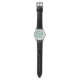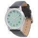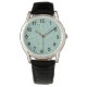 Este relógio masculino tem uma design de Boho de espirais sobrepostas em azul e verde num campo de branco.