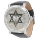 Estrela Negra de David com cruz castanha e números romanos dourados. Nome de modelo criado para você. Fundo de tijolos brancos.