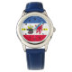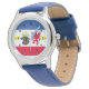 Relógio com design com bandeira variante de Meclemburgo-Pomerânia Ocidental; design com cinco faixas horizontais de vermelho, branco, azul e amarelo, e com ilustrações da cabeça do touro e da águia vermelha