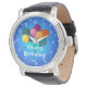 Feliz balões de comemoração de aniversário num fundo festivo cheio de estrelas.